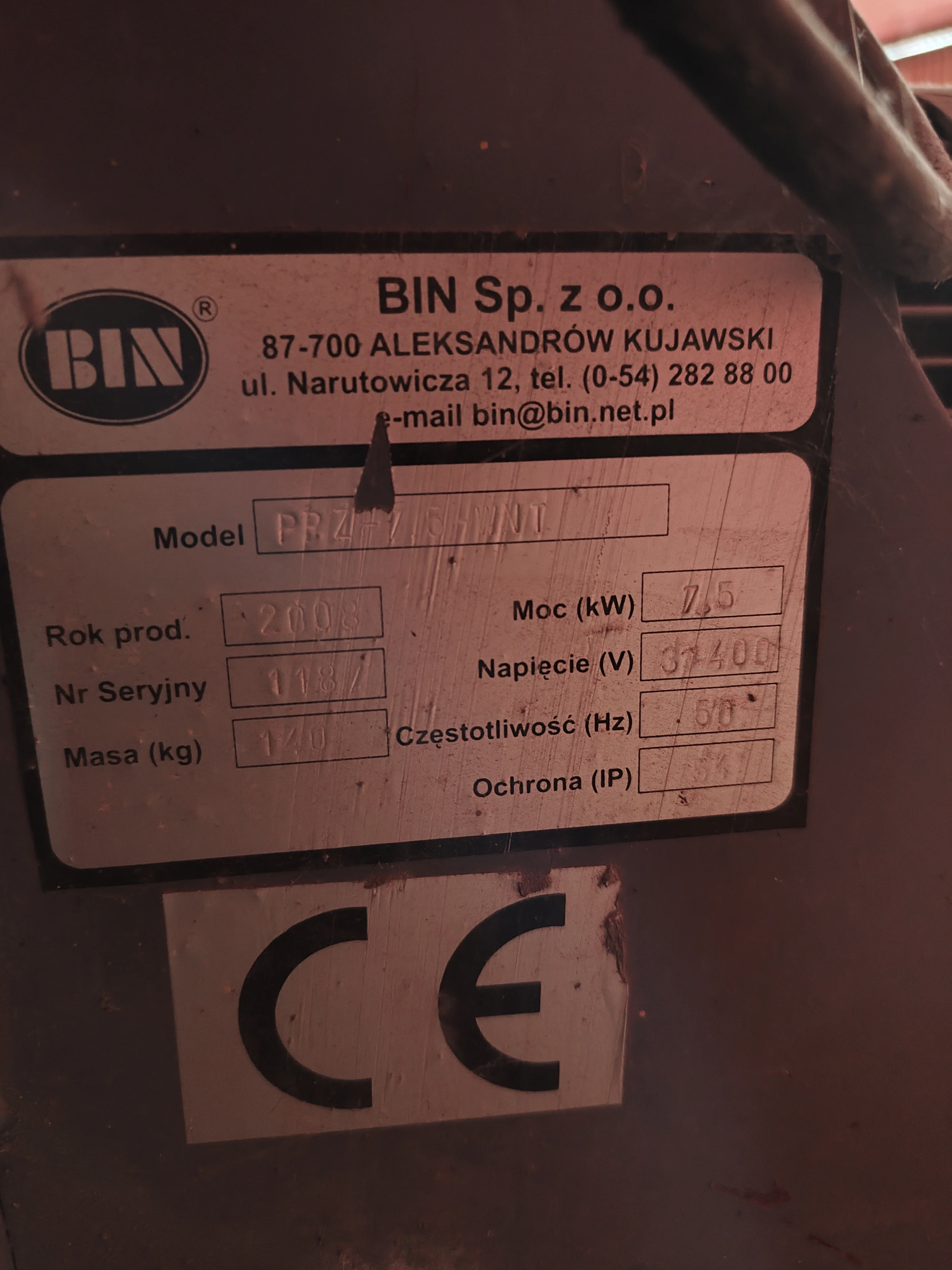 Zdjęcie przedstawia tabliczkę znamionową urządzenia wyprodukowanego przez firmę BIN Sp. z o.o., która specjalizuje się w technologii przechowywania ziarna i przygotowywania pasz.
